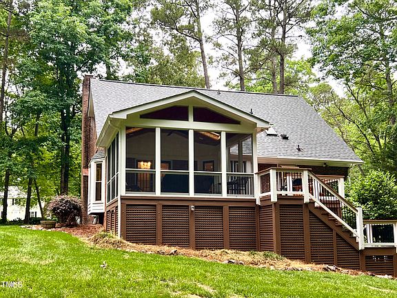 Nature lovers check this out! .97 Acre lot backs to woods but .08 walk to Trader Joe's. Built-in-screen porch and new deck added 5/02/2025. Amazing View! Huge Kitchen w/ custom cabinets, glass front doors, granite counters, tile backsplash & SS Appliances. Hrdwoods throughout. First floor Master w/ walk-in-closet. Family Rm w/Fireplace & built-in-bookshelves opens to Screen Porch. Second floor boasts 2 large BR's hall bath & walk-in-attic. Basement has been a wonderful home office adjacent to one car garage. Plenty of storage space.
