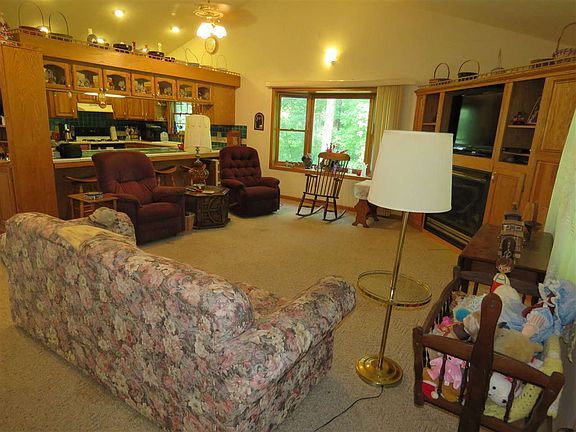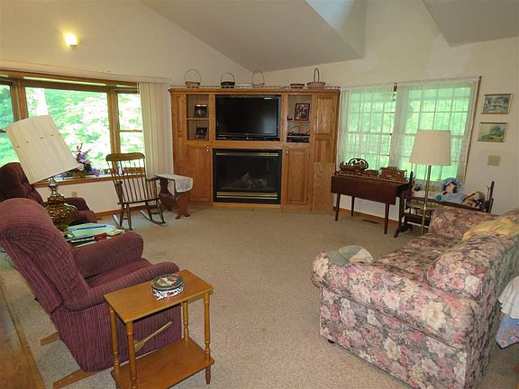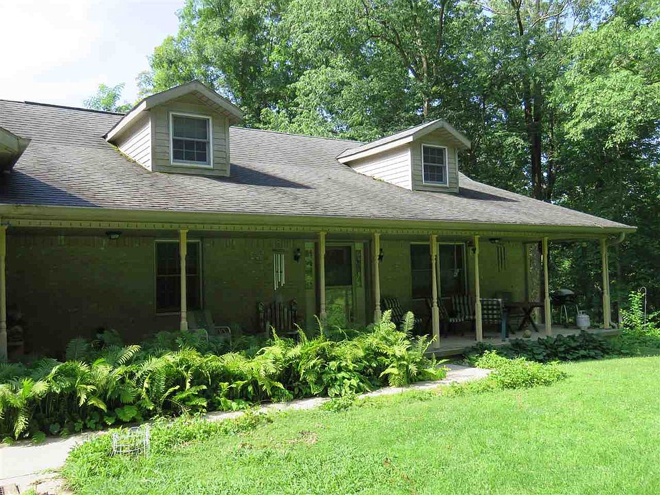 Two acres of woods surrounding your new home gives you a sense of peace off the beaten path! Inside you will find an open concept living area and cathedral ceiling. Lovely built-in entertainment center has gas log fireplace. The master bedroom has double closets and full bathroom. Two other bedrooms on the main level. Spacious fourth bedroom upstairs is accessed from the garage, and has it's own half bath. Also accessible from garage, the bonus room is a great place for hobbies like sewing or office space. Attached garage is tall enough for an RV and also includes a separate workshop area as well as a full bathroom. Plenty of space for storage or projects! Outside you will find a relaxing front porch, spacious back deck, fruit trees, and raspberry bushes. Located in Knightstown Lake Subdivision, Tri High Schools.