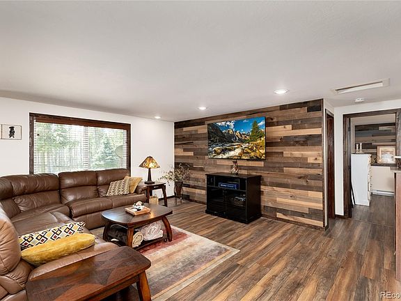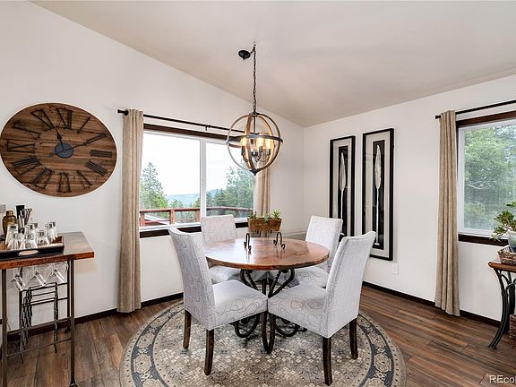 This beautiful, raised ranch home has been totally updated & remodeled by a master carpenter in the last 5 years. The exterior of the home is Shou Sugi Ban siding made in the USA. That is a Japanese process used to preserve the wood by charring it. The surface of the boards makes the wood fire retardant as well as resistant to rot, insects and decay. The sunny mudroom on the lower level opens to a large family room, two bedrooms & a full bathroom. Custom woodwork accent walls and plank laminate flooring are just some of the high-end finishes in this exceptional home. The lower level is heated by a Jotul cast iron gas stove & electric baseboard heat, while the upper level is heated by a LOPI cast iron wood stove & a Renai electric heater. The laundry room is located in lower level & the new Samsung washer/dryer will stay. A sliding “barn door” next to the laundry room conceals a large storage area. This home offers 3 spacious bedrooms + an office/hobby room which could be used as a 4th bedroom. The fabulous kitchen has custom-built wood cabinets, butcher block & granite counter tops, a farmhouse sink, & stainless steel appliances. The kitchen opens to a great room with a vaulted ceiling. Abundant windows let the sun shine in & capture the views in this quiet, serene bit of paradise. The house sits on two acres filled with aspens and lodgepole pine trees. Approximately 50% of the yard is fenced with easy access from the back door & the large deck off the upper level. The gas firepit on the deck as well as the gas firepit in the front yard will stay. The detached, oversized, 3-car garage offers abundant storage space and a workshop area. Only 45 minutes to downtown Denver & the Tech Center! This house comes with a locked in REDUCED MORTGAGE RATE as low as 6% through List & Lock™. This is a seller paid rate-buydown that reduces the buyer’s interest rate and monthly payment. Terms apply, see attached disclosures for more information.