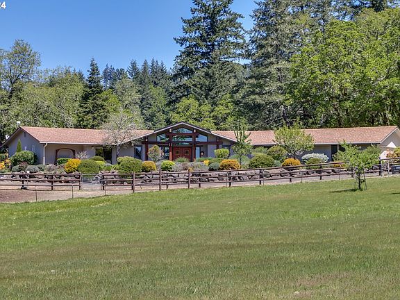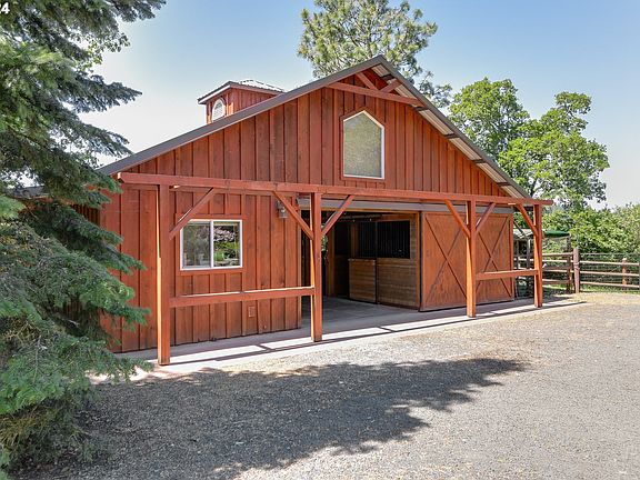 YOU'RE READY TO GO ON THIS ONE w/ TRACTOR AND RIDING MOWER INCLUDED IN SALE! (w/ acceptable offer) RUSTIC SW Eugene EQUESTRIAN estate on 6.42 acres, just 2.7 miles out Gimpl Hill Rd in the 4J school district with a beautiful one level, lodge style, Meltebeke home. 3 bedrooms AND a dedicated office, vaulted, open beam ceilings, walls of windows, plenty of storage, and warm wood accents. The property offers a 5-stall, Greg Stallings barn with a stamped concrete breezeway, a heated tack room with a hot/cold water sink, and custom stall fronts with feed doors.The 70x96 covered arena was built in 2022, also by Stallings Barns, and features lights & sand footing.A 20x44 workshop with a concrete floor, sink, and vehicle size door makes for great equipment storage. Oak Savannah, level and sloped topography, and RV parking with water and electrical hookups. There are approximately 2.5 acres of pasture fenced with no climb mesh and electric that features an amazing track for winter turn out and feed control in spring/summer. This is a gorgeous setting with pastoral views beyond your own property and it's just minutes from shopping & dining. 8 miles to University of Oregon, 60 miles to the Oregon Coast at Florence, and 11 miles to the Eugene Airport. Please inquire for additional information documents and link to video tour.
