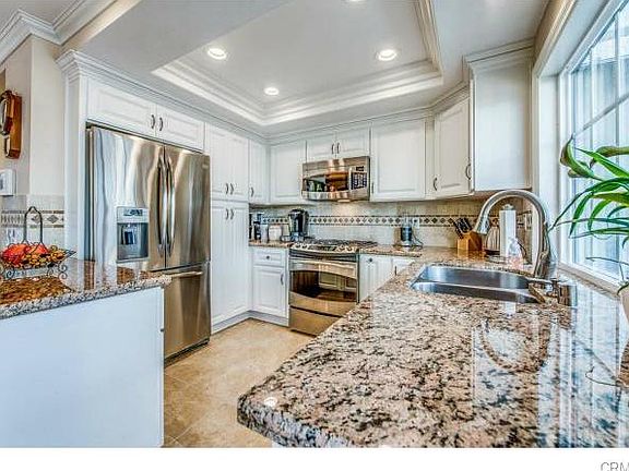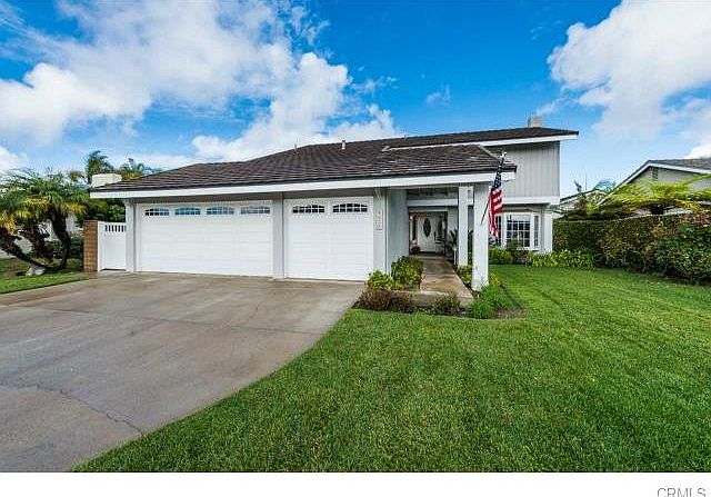 Beautiful expanded and upgraded home in very desirable Landmark neighborhood. Great curb appeal as you drive up to the house, which has four bedrooms, two and a half bathrooms, and a three car garage. The custom front door opens to an entry with the living room on the right and the dining room on the left. Enjoy cozy evenings in the living room with its fireplace that has a custom mantel and surround and travertine tile. The living room also has a bay window looking out to the front yard, and a large window looking out to the back patio. There are hardwood floors in the dining room and the family room. The kitchen has been upgraded with custom cabinets and granite counters. All bathrooms have been updated, and the windows are all double pane with custom casings and sills. There is a sliding glass door to the covered patio off the kitchen, and another sliding glass door from the family room to the back patio. Ceiling fans are in all the bedrooms and in the family room. The living room and kitchen have recessed lighting, and all rooms have crown moulding. The water heater is tankless, and the roof is made of concrete tiles. This fabulous home is close to the beach, park, schools, and shopping.