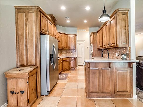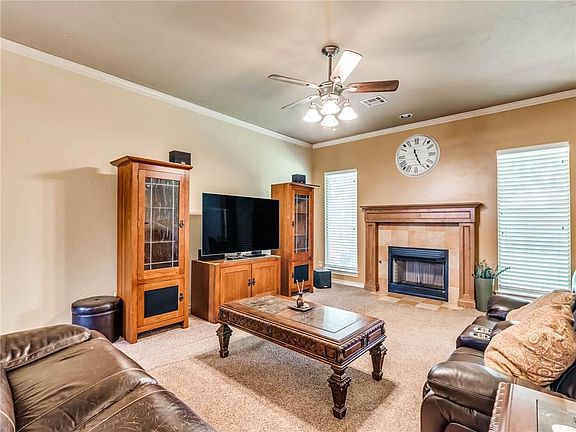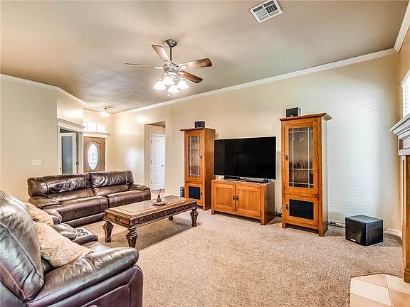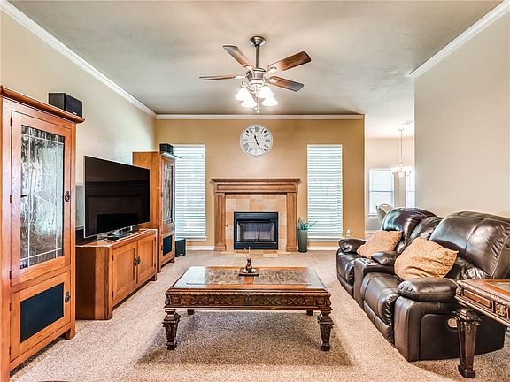 Roomy 3 bed with an office with the convenience of Oklahoma City city limits and award winning Piedmont Schools. Kitchen features solid surface coutertops, glass cooktop, tiled backsplash,stainless appliances, and updated lighting. Adjoining oversized dining area with lots of windows offering natural light. Open living room wood burning fireplace. Large master suite with tall ceilings, jetted tub, separate large tiled shower, double vanity and a huge Australian closet. Good sized bedrooms with large closets. Office features french doors to the entry. Utility has lots of storage space and room. Nice back covered patio, extended with flagstone pavers and a large storage building. Storm shelter in garage floor.