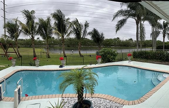 This waterfront Pasadena Lakes pool home features 4 bedrooms and 2 bathrooms. Separate utility room, neutral tile throughout, updated kitchen and bathrooms, accordion hurricane shutters, lush tropical landscaping, french doors, cabana bath, new water heater and roof approximately 7 years old. Centrally located to everything. No HOA.