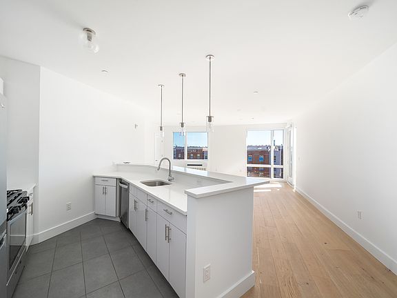 Welcome to the newest waterfront luxury development at The Churchill Estates, where modern living meets sophisticated style. This spacious 2-bedroom, 2-bathroom residence spans 1,200 sq. ft. and faces east, offering stunning views of the NYC skyline. The gourmet kitchen is a chef's dream, complete with high-end Whirlpool appliances, custom white cabinetry, Quartz countertops, and a central island, ideal for both cooking and entertaining. The living area opens onto an expansive private terrace, perfect for outdoor relaxation and gatherings. The master suite is an elegant retreat, featuring a generous walk-in closet and a luxurious ensuite bath with marble floors and walls, custom glossy white cabinetry, Quartz vanity, and a glass-enclosed rain shower. Sunlight streams through floor-to-ceiling windows in select areas, complemented by high ceilings and light oak flooring throughout. With an open layout, ample storage, and an in-unit washer and dryer, this home is designed for ultimate comfort and convenience. Residents can also enjoy premium amenities, including a fitness center and a conference room. Garage parking is available for $150 per space. Situated just off River Rd., this residence offers an unmatched blend of luxury and prime location.