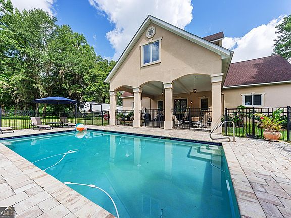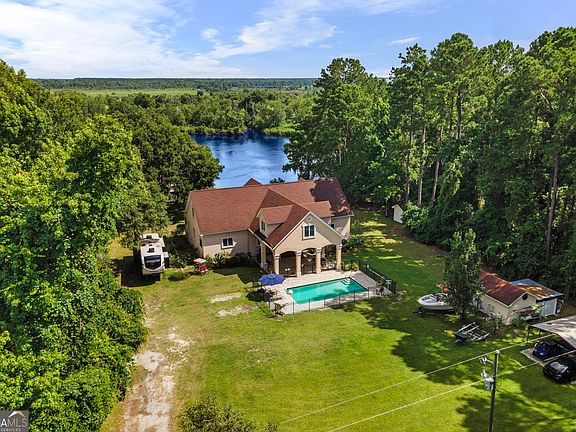 Experience waterfront luxury living at its finest with this stunning property located on the Satilla River. Perfect for entertaining, this home features a floating dock, inground pool, and two outdoor covered porches offering breathtaking views. Inside, you'll find a spacious open floorplan with vaulted ceilings and floor-to-ceiling windows showcasing the river vista. The gourmet kitchen is a chef's dream, featuring a cooktop, double ovens, warming drawer, beverage fridge, and separate upright freezer, and two sinks. The master suite on the main level includes a walk-in closet and a spa-like bath with a soaking tub and separate shower. A convenient half bath/powder room is also located on the main level. Upstairs, a game room/media room is complete with a wet bar and fridge. Two additional bedrooms each have ensuite full baths and river views. Additional highlights include a large level yard ideal for play or pets, covered parking currently utilized as an outdoor patio, and a separate workshed/storage building. Conveniently located near Jacksonville & SSI Airports, Jaguars Stadium, and Vystar Veterans Memorial arena, this home also offers easy access to popular sites like Fernandina Beach, St. Simons Island, Cumberland Island, Savannah, and St. Augustine. Don't miss the chance to call this riverside retreat your own!
