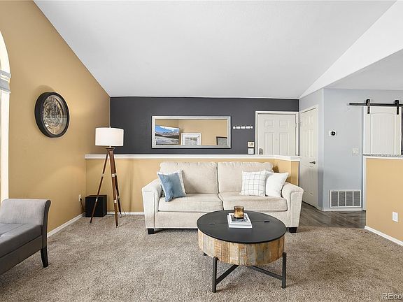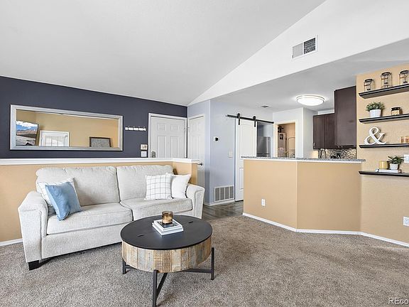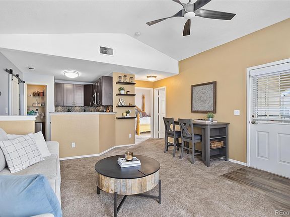 Charming condo in the Saddle Ridge condo community! This delightful 1-bedroom, 1-bathroom home is completely updated with modern finishes. The family room is adorned with a vaulted ceiling and a cozy fireplace. From here, you'll have access to the covered balcony for relaxation. The beautiful kitchen boasts gleaming marble countertops, stainless steel appliances, a convenient pantry area, and laundry closet with a full-size stackable washer and dryer, hidden with a stylish barn door. The bedroom features high ceilings and a spacious walk-in closet. The generously sized full bathroom is well equipped with modern fixtures. Completing this move-in ready home is an attached one-car garage and an outdoor deeded parking spot. Nestled within a quiet neighborhood, residents enjoy access to lush green spaces and a community clubhouse with a fitness center and sparkling pool. This prime location provides quick access to I-25, DTC, shops, and restaurants. Recent upgrades include a new roof and newly paved surfaces. Schedule your showing today!