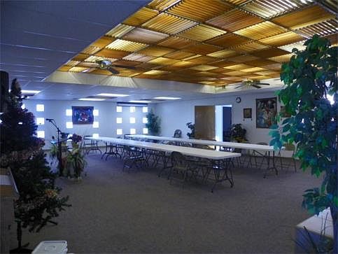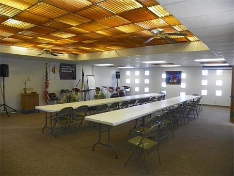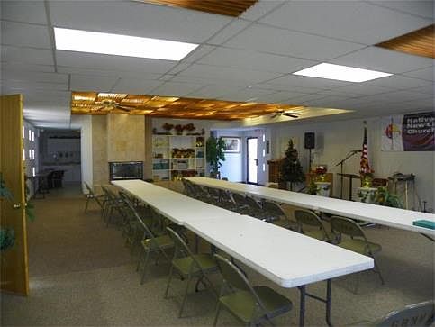 Updated commercial building on large corner lot. Presently being used as a church but could easily function as office space. This property has radiant floor heating, a gas log fireplace and attractive architectural drop ceiling and glass block accents. Two offices and large open area that could accommodate an open office system. Small kitchen with refrigerator, sink. Two bathrooms.