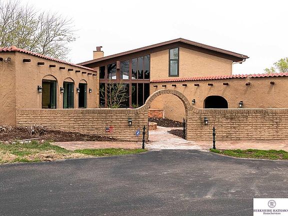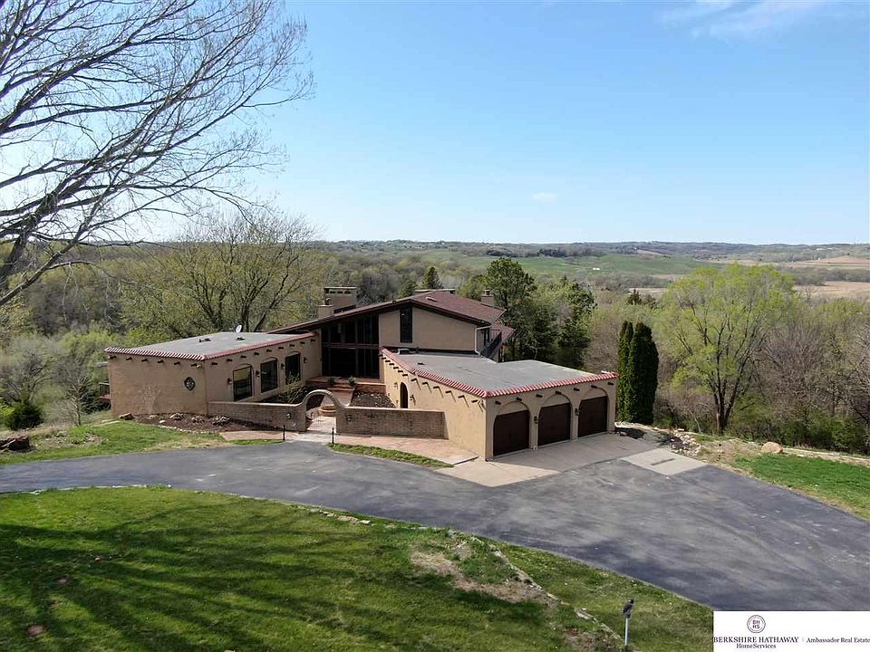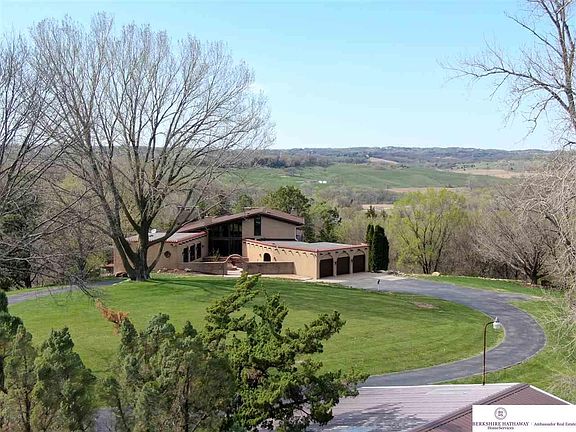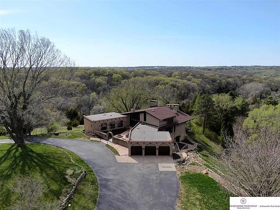 Absolutely stunning property with amazing views & privacy all on paved roads! Sitting on 34.6 rolling acres, "Moonstruck Ranch" is your own personal resort complete with salt water pool, that looks out over a serene wooded valley! Perfect home for entertaining or to get away from the city all while only being aprx. 10 min. from Omaha. 3 metal outbuildings(horse barn,shop & huge Astro(type) building), architecturally custom lines, ceilings, rooms utilizes the natural sunlight to the fullest with massive amounts of windows throughout. Gorgeous updated kitchen with quartz counters, commercial grade appliances, custom "coffee bar" that opens to hearth room with vaulted ceilings, 1 of 3 fireplaces walks out to brick courtyard for continued enjoyment of nature & the pool. Main flr laundry with large/convenient mud room off kitchen & garage. Updated master suite has private balcony for breathtaking views, spa like custom bathroom & walkin closet. This meticulously maintained property has too