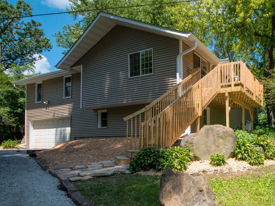 Stunning, renovated top to bottom 4 bedroom/2 bath home nestled into hillside just minutes from Bohner's Lake. New roof, newer windows, refinished/new hard wood floors in living, dining, & kitchen, new carpet in all bedrooms & lower level family room. Vaulted ceilings on main floor with lots of large windows for a ton of natural light. Large front deck overlooking peaceful wooded yard. Open concept kitchen complete w/granite counters, SS appliances, large pantry, and 7' island w/breakfast bar for 4. Master suite has french doors to side yard, large walk in closet & gorgeous bath with ceramic tile floor & shower. Attached extra deep 2 car garage plus additional single garage space under opposite corner of home. 8x10' shed in corner of private back yard is perfect for lawn equipment.