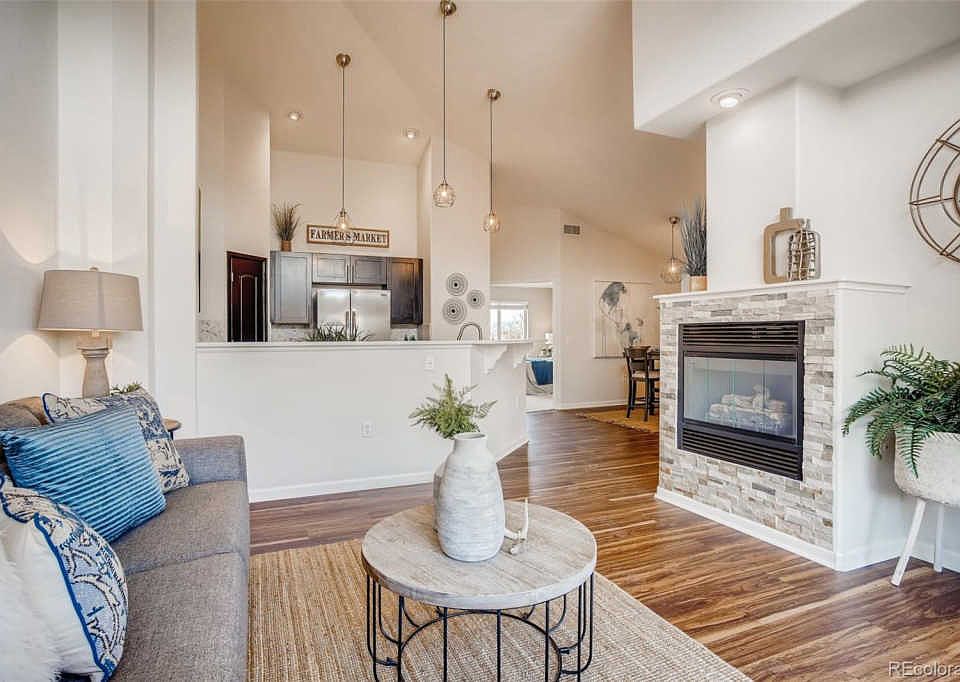 Beautiful and dramatic upstairs unit in prestigious Gold Peak, new finishes and appliances throughout! Ready for a quick move in or fantastic rental opportunity in a low maintenance community.Mature William Baffin climbing roses flank the front door, which opens into a foyer that connects to the alley-accessed garage and a large storage closet under the stairs. The garage has an additional storage area, high ceilings, and a smart door opener. Head upstairs and you are immediately struck by the dramatic vaulted ceilings and warmth of the open floorplan. The breakfast bar overlooks a kitchen with quartz countertops, marble mosaic backsplash, and brand new stainless steel appliances, including a gas range and microwave/hood with outdoor venting. Numerous clever details like USB outlets, a built-in wine rack, and a hidden undercabinet "garage" for a robot vacuum.2nd bedroom with French doors, vaulted ceilings, and stunning views of the mountains and golf course next door. 2nd bathroom with marble floor tile, oversized tub, floating vanity, and great natural light.Bonus room could be home office, non-conforming 3rd bedroom, exercise room, etc.Family room w/ cozy gas fireplace, glass wall w/ two sliding doors to the patio, wiring for surround speakers, and a Haiku smart ceiling fan.Master suite features a huge walk in closet and a beautiful bathroom with oversized tub, marble floors and a floating vanity.Patio has a pergola w/ integrated lighting, gas connection for a BBQ grill, power outlets, and planter boxes/privacy screens that are included.Palomino Park Amenities: Tennis & Pickle Ball Courts, Frisbee Golf, Baseball & Football/Soccer Fields, Dog Park, Playground, Pond w/Gazebo & Fountain, Chipping/Putting Green, Indoor basketball & racquetball courts, fitness center, locker rooms with steam, resort pool, bar, & more!Gold Peak specific private amenities: Cabana with grills and a massive in-ground spa with access control.