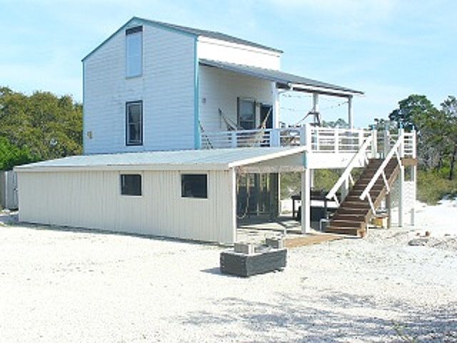 Adorable beach house in the Cabana Beach Subdivision sits on a high lot in the sand dunes overlooking an 8 acre nature preserve and Bon Secour Bay. The property includes a deeded interest in two lots, one directly on the Gulf of Mexico and another on Bon Secour Bay used exclusively by homeowners and their guests. The house was built in 2001 and has been well maintained and a sturdy structure with a quality metal roof and freshly painted hardiplank siding. The elevated house has the bath, kitchen and living with an outdoor deck on the first floor and a loft with walk in closet up the stairs. Underneath is plenty of space for cookouts and swings, lounge chairs, a workshop, plenty of storage and a parking area large enough for a RV. Take a golf cart to the private Cabana Beach on the Gulf of Mexico or drive there and park your car next to the beach. Thank you for viewing this home and email me wvanland@gmail.com for a detailed fact sheet. The home is rented and no on site visits without prior permission. I protect buyers brokers and pay a 4% commission. Email William at wvanland@gmail.com to register and I will confirm in writing.