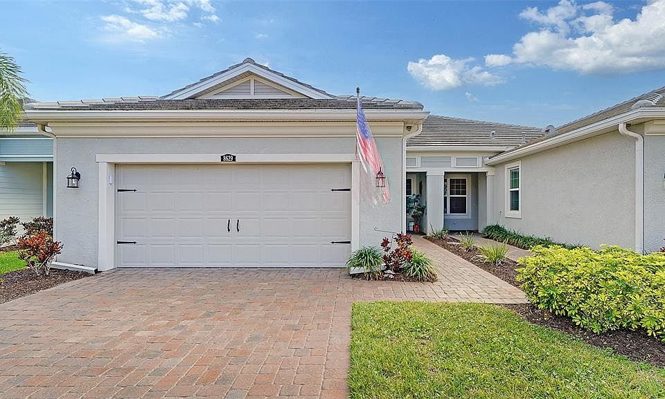 Spectacular Bay Port Model with over 2,400 sq.ft located on desirable Sunrise Preserve in Palmer Ranch, is now available for purchase. This Villa has a spacious 2 car garage with beautiful epoxy floors, garage storage and 240v Electric Vehicle hook-up. It has a recently cleaned and sealed drive way and a stone walkway that leads you into a charming entry porch. This unit has the most sought after floor split floor plan for perfect living. A gourmet kitchen, which is a center piece of this home, with a large quartz island and pantry, define a great space for cooking and entertaining. The elegant living/dinning room, with beautiful crown molding and upgraded light fixtures, has an open floor plan giving direct access to a large screened lanai from where you will enjoy peaceful views of lake and trees that surround and landscape the near by homes on Sunrise Preserve. This unit has a generous sized Master Bedroom Suite with a walk in closet and a large bathroom with dual sinks/vanity counter and a wonderful walk in shower. The Master Bedroom has been intentionally located in one side of the home where you will enjoy the lake views and quietness. The Den, Second Bedroom and Bathroom, as well as the laundry, are located on the other wing of the house, allowing privacy and perfect circulation integrated by a welcoming Entry Hall. A sensational Walk-in Tub, in over $17,500 upgrade, has been installed on the second bathroom and adds to this home a great feature as well as all ceiling fans/fixtures. A tray ceiling with fan and fixture was added in the Master Bedroom as well as custom window treatment throughout, new carpeted areas and crown molding. There is a large walk in type Laundry room and multiple closets for extra storing space. Besides the prime location, that includes one of the best schools districts in Sarasota, not only the high construction standards have been delivered by the developer, but Sunrise Preserve has incredible amenities including a resort style pool, tennis, pickle ball courts, bocce ball, grill areas, fire pit, clubhouse for entertaining your guests, fully equipped fitness center, planned activities and events, making socializing easy and fun. Literally minutes from the squeaky sands of Siesta Key, beach number one in the US, shopping, conveniences, I -75, Sunrise Preserve is the perfect community for you to enjoy or to invest for the future.