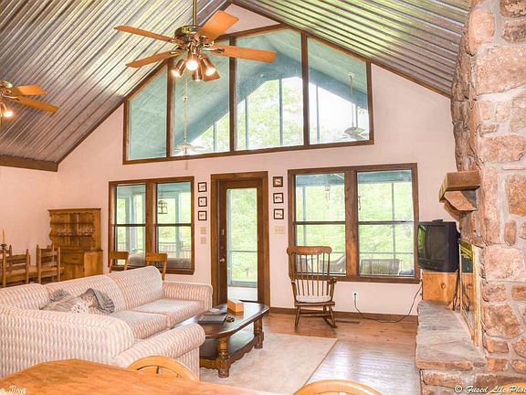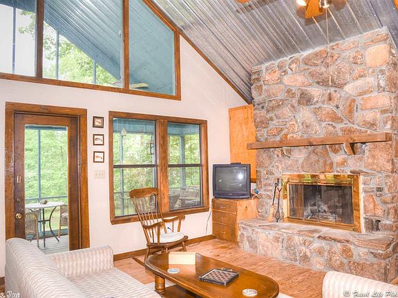 The white line is very close to the water, (trees could be trimmed or cleared to improve view) and this property has one of the easiest walks to the water you will ever find. Two natural stone fireplaces (one in Master bedroom), a fun sleeping loft, vaulted ceiling, screened porch. The lot is approx. 2 acres & the beach comes out to a nice point in the Salt Creek area. This property has so much potential! Some photos were taken below the white line. Furniture negotiable.