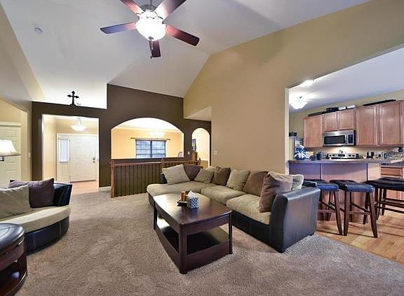 Wentzville Schools! Prepare to fall in love w/this terrific brick & stone-front vaulted ranch residence w/ideal open floor plan. A charming covered front porch welcomes you into the formal entry foyer featuring handsome hardwood flooring that is also found in the kitchen & breakfast room. The space flows naturally into the formal dining room/bonus room + the spacious great room where you'll find a soaring cathedral ceiling & a marble surrounded woodburning fireplace. The chef in you will delight at the bright & inviting kitchen offering ample 42" custom cabinetry, breakfast bar, stainless appliances & adjacent breakfast room w/bay-set French walk-out to the patio & level yard. Ultra-convenient main floor laundry room. Retire in true comfort to the oversized master suite providing a walk-in closet + a private very updated bath w/adult height double vanity, soaking tub & walk-in shower. 2 addtl beds, full bath don first floor. Oversized 3-car garage, elec pet fence, all new carpet 11/16!