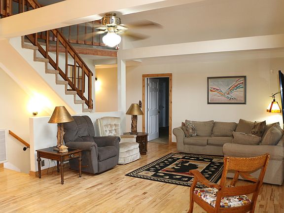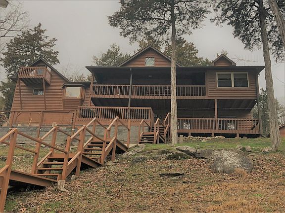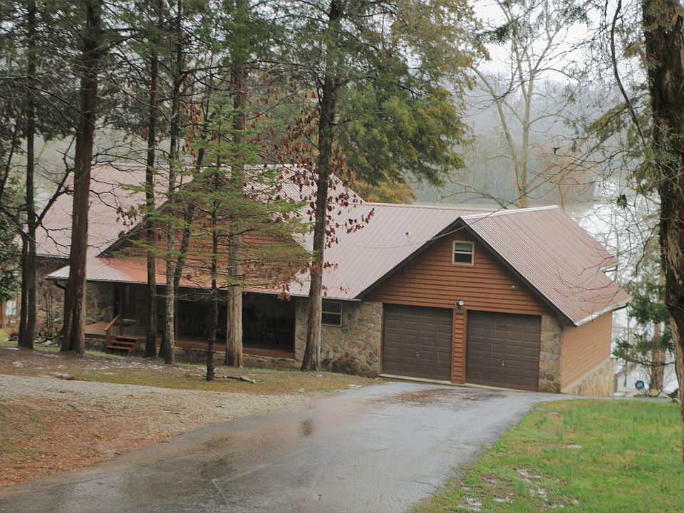 Custom lakefront home in protected island cove with gorgeous panoramic views from decks and open great room under soaring cathedral ceilings. First floor master with updated bathroom, adjoining sitting room and guest room, main level 2-car garage makes it easy for one-level living along with beautifully updated kitchen with granite tops and counter seating at the island, plus adjoining dining room and a workshop. Equally ideal for 2nd home lovers or investors (rentals allowed) with up to 8 bedrooms, fam room, rec room and bonus suite above the garage. Covered porch, full width decks, fire pit area, lakefront deck seating and large covered 2-slip dock plus loads of parking and storage space abounds and the community boat launch ramp is close!