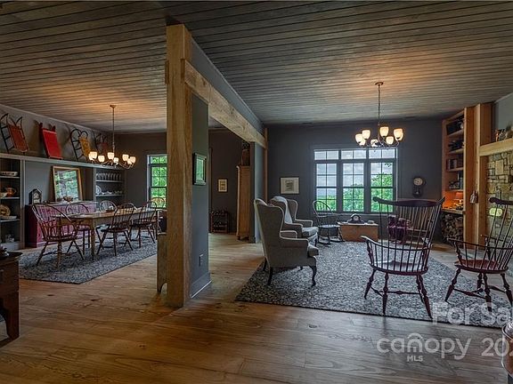 A unique home hidden privately from the road on over 15 acres of towering forest on both sides of a flowing creek—opening to expansive mountain views. The home itself blends openness with defined spaces—ten foot ceilings, a living and dining room fronting a stone fireplace flanked by a cozy library. The kitchen provides a Viking range with granite counters and sinks open to a breakfast nook. A spacious pantry adjoins the kitchen.