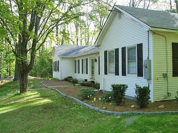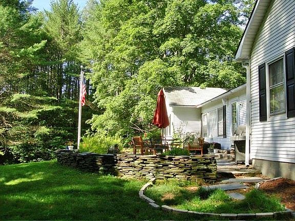 Single level home with recently built 1,440 square foot garage. The garage has its own gas furnace with radiant heat, impressive construction and an attached carport and storage area. A sought after location near the golf course and Farms on a paved road. The landscaped yard overlooks a neighboring field and the wooded area leading to the brook with waterfalls. The home has many improvements and lovely features, a stunning built in bookcase, updated baths & kitchen and central air conditioning. Delayed showings until Nov 18, 2023
