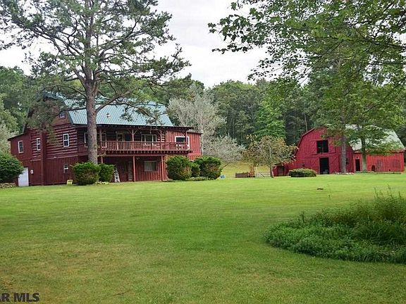 Paradise found just off I-80 welcomes you to a Log Home estate on 21 acres, large golf-course like yard, pasture, fruit trees, and no through traffic! Great rainbow trout, bass, catfish pond fed by several springs is a daily pleasure to watch/feed. Large 40' x 60' 2-story barn with several stalls, high tensile fenced pasture. Log home is made of hemlock logs and boards, has 2 kitchens w/Custom wood cabinets, 4-5 bedrooms, office, 2 fireplaces, trophy display loft, picture windows on both sides to enjoy the deer, turkey, bear, grouse, geese/ducks. Small cabin at pond with bridge across pond to make another haven into nature. Borders over 5,000 acres of state forest land. 14-month home warranty included. Call for your private tour today!