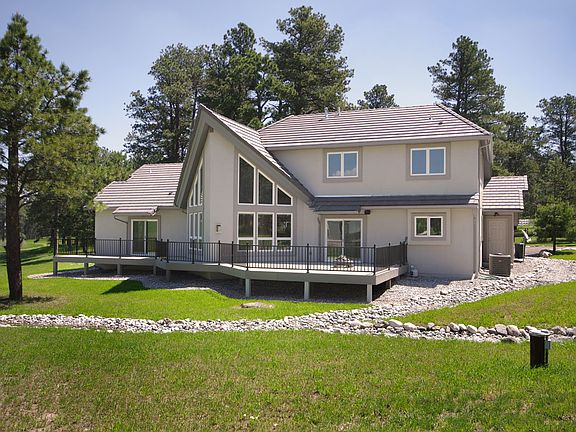Remarkable 2 story custom home on a serene 7.5 acre property nestled in the pines. Features include a covered double entry, bright and open floor plan, vaulted and beamed ceilings, a wall of high windows, archways, granite, slate flooring, and a main level study/ dining room. Spacious kitchen with 42" cabinets, granite counter-tops, stainless appliances, gas cook top, pantry, and walk out eating area. Main level, walk out master suite with sitting area. 5 piece master bathroom with electric in-floor heat and steam shower. There are three more bedrooms upstairs and a full, double vanity bath. Spacious laundry and the Whirlpool appliances are included. Wrap around trex deck. Nice two stall barn with automatic water, shop, parking, and riding arena. Zoned for up to three horses. Private road and cul-de-sac in the heart of Black Forest.