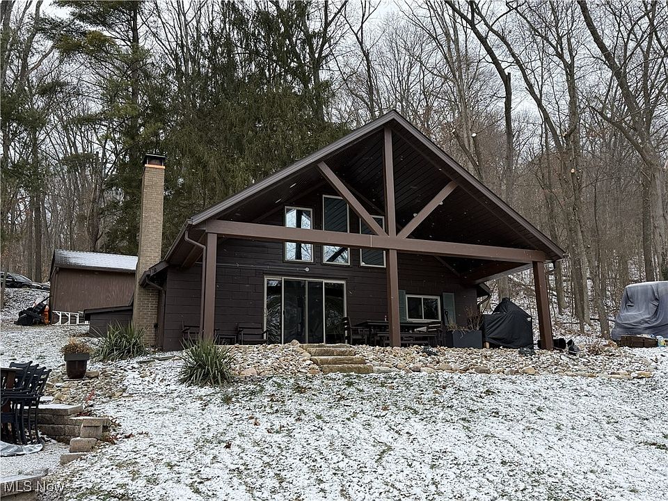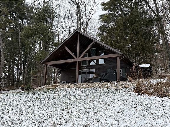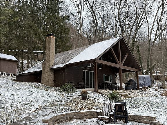 Scenic panoramic views of Tappan Lake from the newly added covered front porch. Tastefully remodeled in 2023, this 3 bedroom cedar cottage includes all new interior doors, new drywall and white oak hardwood floors. Brick wood burning fireplace in the living room. Newly remodeled kitchen boasts new painted cabinets, quartz counters and tile backsplash. 2 bedrooms on the main floor with a third bedroom in the loft. Open floor plan with tongue and groove cathedral ceilings. Main floor laundry. Great space for entertaining or relaxing at the lake. Freshly landscaped with a built in firepit. 8x10 storage shed. Newer 60' dock with 6' wide vinyl decking. Boat lift to be replaced with a different lift. Lot T-114, also known as 114 Pebble Lane. Seller to remove ring cameras. MWCD lease fee of $2104 for 2025.