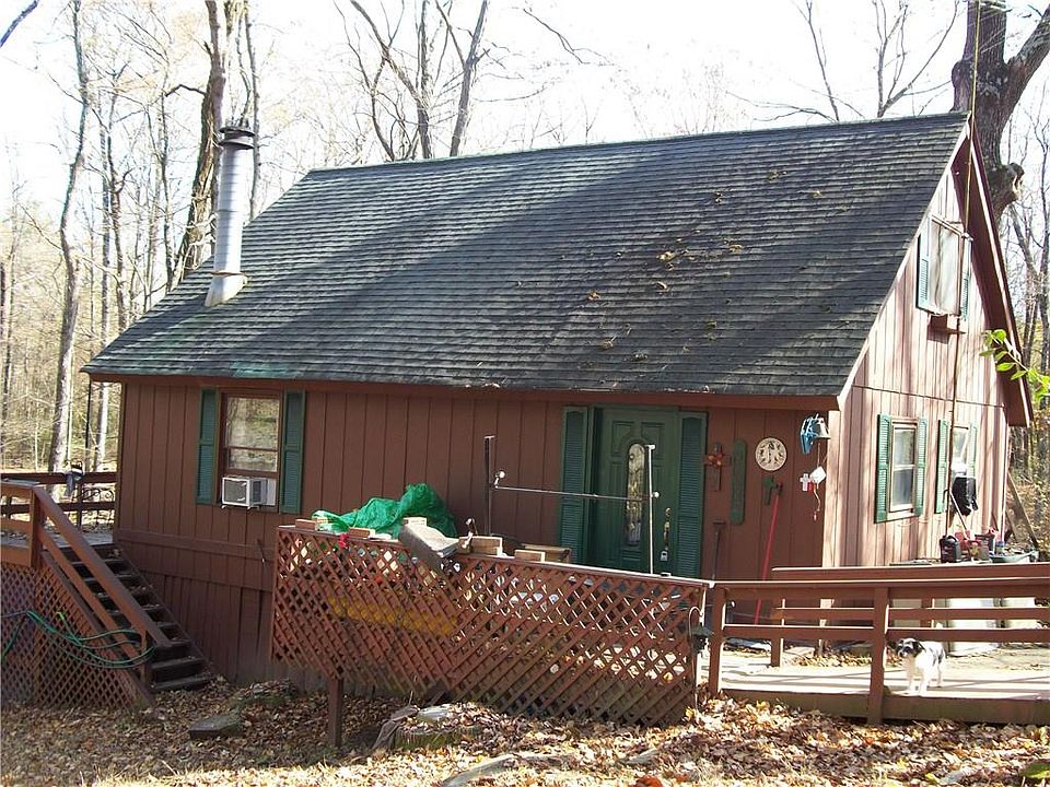 Country cabin on 10 plus wooded acres with a pond. Lots of potential with this property, home does need updated. Nice sized open loft area. Living room with wood burning fireplace.