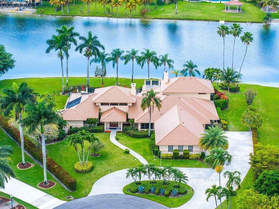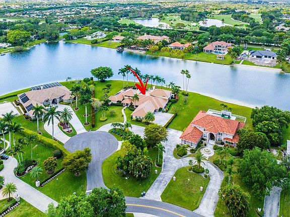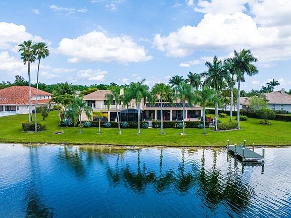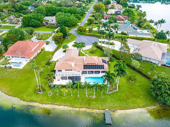 Nestled within the prestigious neighborhood of Banyan Lakes, discover your new 5 bedroom, 5.5 bath home, located on an expansive 1.25-acre cul-de-sac lot. With a new roof installed in 2023, this meticulously maintained residence is the epitome of lakeside luxury. Enter through the grand foyer where you are greeted by soaring ceilings, an abundance of natural light and panoramic lake views that one only dreams of! Offering a blend of timeless elegance and modern convenience, the recently updated kitchen features golden oak wood cabinets, luxurious marble countertops, and a suite of high-end appliances including a Subzero refrigerator, double Thermador ovens, a reverse osmosis system as well as a convenient beverage cooler. As you continue through the home, the pride in ownership, quality construction and attention to detail is evident. The three-way split floor plan features high end renovations of the guest, primary, and cabana bathrooms, pool and lake views from your primary suite, oversized secondary bedrooms with spacious closets and en-suite bathrooms as well as plenty of room for storage! For those in need of extra privacy, a separate entrance from outside for one of the bedrooms offers versatility for use as a home office, in-law suite, or guest quarters. Entertaining is effortless with three wet bars strategically located throughout the residence, whole-home speakers, a spiral staircase leading to a second-floor loft and two fire places setting the mood for any occasion. When you're ready to indulge in your own private oasis, step outside where 365 feet of waterfront views await. Dine al fresco under the approximate 2,000 square ft of screened in patio space or relax and rejuvenate in the oversized, solar panel heated saltwater pool, perfect for a refreshing dip after time spent in the Florida sunshine. If you desire even more living space or dream of a guest house or detached garage to complement this already impressive property, the oversized lot offers ample space for expansion. With endless storage space, an extended 3-car garage, a private dock and a host of luxurious interior and exterior features, this lakeside sanctuary offers a rare opportunity for refined living in one of Banyan Lakes' most coveted locations. Schedule your private tour today and discover the endless possibilities! (Please see document tab for a detailed list of features and community information.)