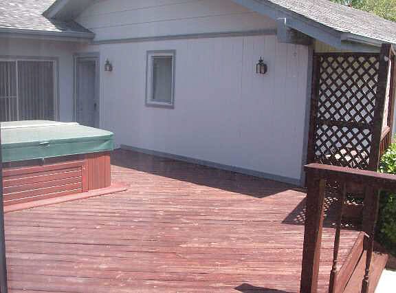 This fabulous home in a quiet neighborhood awaits your arrival. House sits on large corner lot with an immaculate yard. A custom built shed will hold all of the yard tools you'll need. Roof less than one year old. The back deck with a built-in spa is extremely private and would be great for entertaining. Open floor plan with two ceiling fans in the family room. Kitchen has been remodeled with custom cabinets, countertop and flat-top range. Master bedroom is large with custom crown ceiling molding and sliding glass door access to the deck. Oversized two-car garage. This is the perfect season to enjoy the whole-house fan. Custom trim work throughout this house, makes it unique. New carpet has just been installed throughout the entire house.