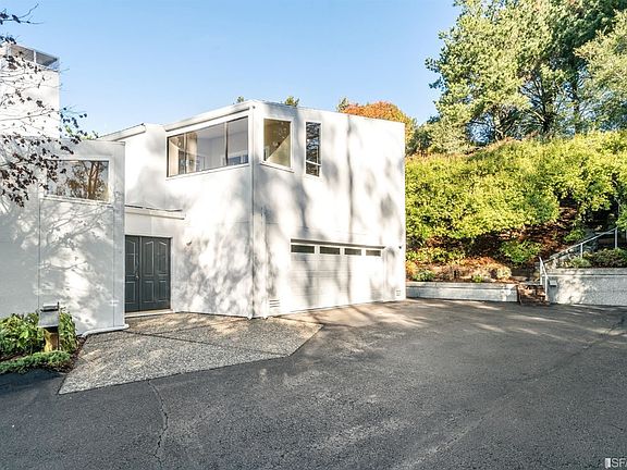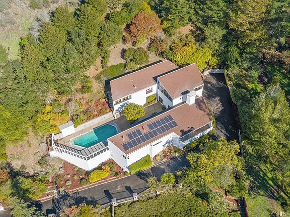 Rarely available 3BD/3.5BA gated El Cerrito Hills 1970s Retro-Style View Home on a stunning 37,000 Sq Ft Lot (.85 Acres) w/direct Bay, SF, and Bridge Views. Nestled in the serene hills at the edge of Wildcat Canyon, Moeser, and Kensington, greets visitors with a grand formal entryway and floor-to-ceiling windows overlooking the interior courtyard, pool, and verdant views to all that lies to the West. The home's main living level boasts a formal living room with vaulted ceilings, fireplace, and big bright windows, a formal dining room that adjoins the roomy chef's kitchen, and impressive view patios and interior center courtyard with swimming pool. Upstairs is a large primary suite with an adjoining home office/den, lots of closet space, and a private balcony. Two additional ample bedrooms with balconies and a shared Jack-and-Jill bathroom complete this upper level. A bonus ground-floor bedroom or den with ensuite bath and private entrance. laundry room AND two-car garage. MUST SEE