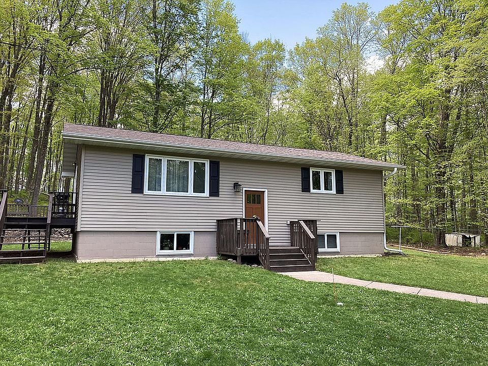 Bi-Level home built in 1984. 2 bedrooms and full combo bath on main level. Basement has a finished bedroom, bathroom with shower and rec room. Unfinished furnace room and laundry. Detached 2-car garage with power and security lighting. Nestled amongst large shade trees for low energy costs