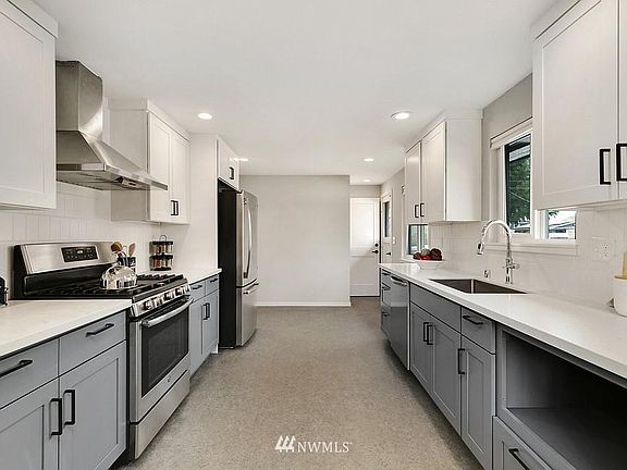 This newly remodeled four-bedroom home is a must-see. Situated on a quiet, residential tree-lined street, the light-filled main level of the home has a new modern kitchen with quartz counters and stainless appliances. The open concept living area enjoys a cozy fireplace and warm hardwoods. The main level also has two bedrooms, a full bath, laundry facilities and your primary bedroom with en suite 3/4 bath. There's another new kitchen on the lower level with additional laundry, large bedroom and separate entry. The attached garage is finished and could be a perfect home gym or flex space. Plenty of off-street parking in the driveway, plus potential for extra parking off of the alley. Newly painted exterior and brand new roof.