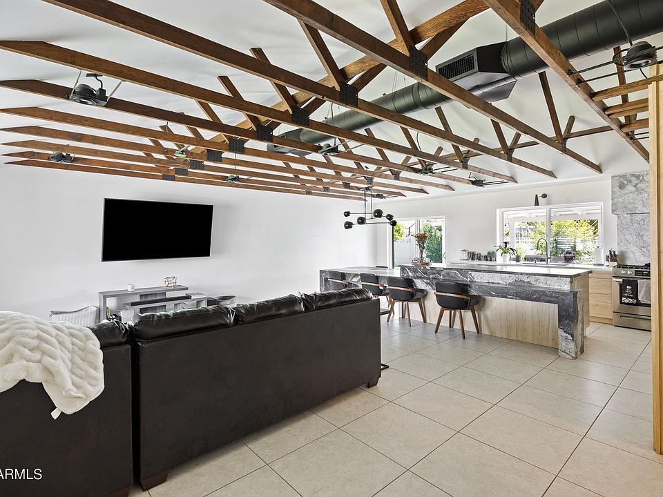 PRICE REDUCTION! This beautifully designed single family home was renovated 2 years ago with soaring vaulted ceilings and exposed wood beams & duct work. As you enter the home you are greeted with the soaring ceilings and jaw-dropping 14ft island. The custom wood wall cladding guides you to either floor. Bathrooms perfectly combine modern touches & natural elements to create stunning, warm and comfortable spaces. The upstairs guest bedroom has detached bathroom with custom finishes and a unique laundry chute. Master bedroom is oversized with a separate toilet room, walk-in closet, walk-in shower, soaking tub. Lower level has laundry room, bonus room & projector TV, built-in desk & the 3rd bedroom & 3rd unique bath. Seller will put up wall for 4th bedroom downstairs - if buyer desires.