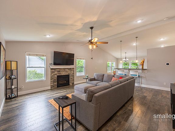 Seller is offering 3% in concessions. Beautifully maintained 5 bed, 3 bath ranch on a private, wooded half-acre lot complete with a fire pit—perfect for relaxing outdoors. The open-concept main floor features cathedral ceilings and a spacious kitchen, dining, and living area that's ideal for everyday living and entertaining. You'll also find 3 bedrooms, 2 full baths, and convenient main floor laundry. The walkout basement is fully finished with 2 additional bedrooms, a third full bath, a full second kitchen, custom bar, and a large rec room—offering flexibility for hosting guests or multi-generational living.