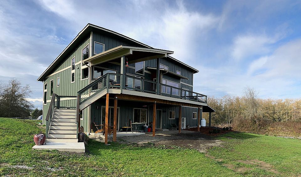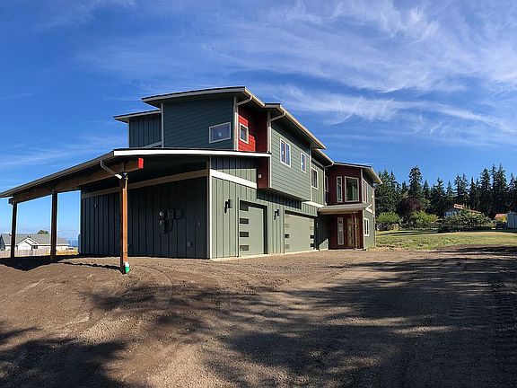 Modern two-story with guest bed and bath and second bedroom on ground floor; kitchen, great room, office, primary bedroom suite and laundry room on top floor. Three garage bays. Architect-designed to maximize the east-facing view of Puget Sound and the Cascade Mountains. Rooftop solar generates as much power as the house uses each year. Heat pump heating and cooling through ductless units; Very efficient heat pump hot water heater.