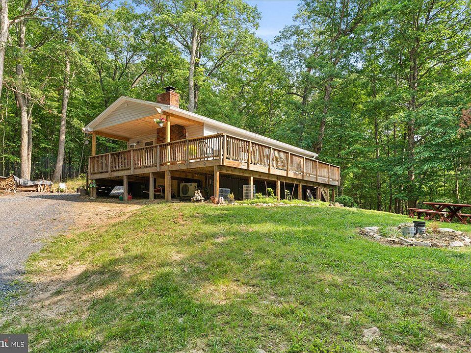 Nestled on 3 acres near the top of the Massanutten Mountain Range, surrounded by woods with a seasonal view from the full deck. Hike through the forest to springs or Wildflower Trail, even hunt as GW National Forest adjoins behind for the Pi in Nature perfect for a full-time home, a second retreat or Short-Term-Rental, the Avg is over $200 a night. The covered porch welcomes all into openness of the kitchen/dining/living room combo with a custom wall of wood at the hearth-woodstove-insert and rustic mantel adding to the warmth of the fireplace. The Cabin has 2 double size bedrooms, all new bath with tiled walk-in shower and glass enclosure. Check the huge storage in crawl from under the decking. Many updates have been lovingly made to this home this past year for family, the list is long. 1.6 miles in & you will have no road dust there. HOA is due semi-annually. Don't miss a chance to see with your agent before the slice of "Blackberry Pi" is gone!