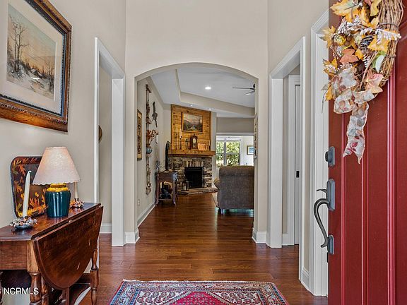 As you step inside, you'll be captivated by the open floor plan, where the eye-catching fireplace takes center stage. The heart pine mantel, crafted from one of the trees on the redesigned Pinehurst Course #4, adds a touch of history and warmth to your living space. The kitchen is a chef's delight with stunning granite counters, stainless steel appliances, a gas range, tile backsplash, and a pantry that will make meal prep a breeze. The elegance of this home extends to the bedrooms with great closet space and a large walk-in shower in the Master. The bonus room boasts luxury vinyl plank flooring, perfect for your versatile needs.