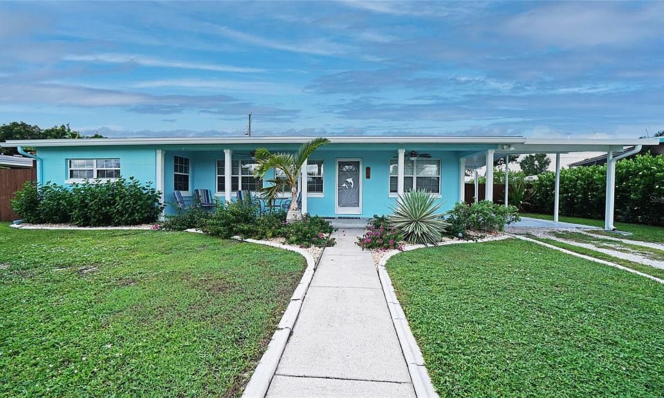 You won't be able to resist this adorable home and it's updates once you take a look. New roof in 2019 and new carport added in 2020. The seller has also added Bahama shutters on the rear windows. As you drive up you'll feel like you're going to your sweet beach cottage. You can enjoy the beautiful Bougainvillea flowers and other landscaping while sitting on the long and inviting front porch. Once inside you'll like the tile floors in the large living room/dining room combo (no carpet in this home) with a slider out to the carport area. You'll also be able to appreciate the large number of cabinets in the kitchen as you can never have too much storage. Both bedrooms have laminate flooring and blinds/drapes window treatments. The bathroom is a cheerful retro color with a tub/shower combination. The laundry is in its' own room just outside the back door. You'll love the private back yard which is privacy fenced and is complete with a 120 square foot shed (with electricity and lighting). There is extra space to the right of the driveway where seller was able to park a boat. As for the location nothing is that far away in any direction including Punta Gorda with it's downtown attractions as well as Fisherman's Village where you can shop and dine as well as book a boat tour. You'll be about a 30 minute drive to the outstanding beaches of Boca Grande and Englewood. Port Charlotte and North Port offer many shopping and dining choices as well. You'll have many choices of golf courses and boating and fishing opportunities. You will want to make this one your own.
