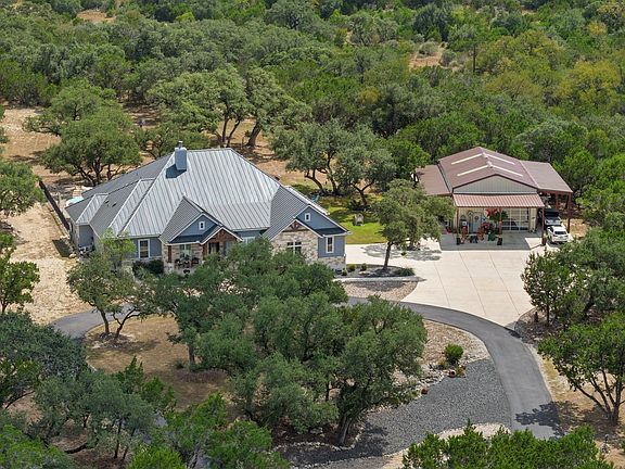 Luxury living meets adventure with this beautiful home situated on nearly 18 fully fenced and gated park-like acres with its very own private cave to explore! The 3 bed/3.5 bath main home offers everything for sophisticated living: a chef's kitchen, designated office space, formal dining area, bar area, sun room, primary bathroom spa-like retreat, and a dream pantry/ laundry room combo! Outside you will find a sparkling pool with a waterfall and slide, an outdoor kitchen, a beer tap, motorized patio screens, chicken coop, garden, storage building, RV hookup, solar panels & well. If that isn't enough, there is also a shop with a tool shed, covered awnings, storage upstairs, plenty of room for projects or game tables and a 1 bed/1 bath apartment downstairs for your extended family or guests! 864 Coyote Ridge Road is where everyday living feels like a getaway. Don't miss out on this once in a lifetime opportunity to go from poolside relaxation to private cave exploration all from the privacy of your own slice of the Texas Hill Country! Call today for a private showing of this amazing estate!