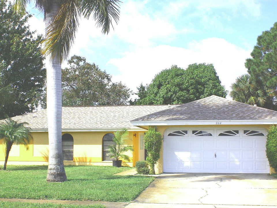 Beautiful 3/2 home centrally located in a well established neighborhood in Rockledge Fl. only minutes to Melbourne, Viera, Cape Canaveral and the beaches. Very spacious & bright open floor plan with large eat-in kitchen, vaulted ceilings, large jacuzzi and walk in closet in master bath, plus a huge screened patio overlooking a private back yard with a mature shade/ mango tree and oversize 2-car garage. This home has been meticulously maintained inside and out with newer roof, new AC condenser, new exterior paint, and tile floors with brand new carpet in bedrooms.