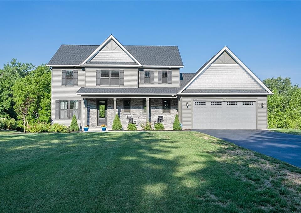 VICTOR SCHOOLS! Custom build by Polidori and Ferri on private drive! Modern siding color with cedar impressions and stone faced open patio for amazing curb appeal. Enter the foyer loaded with natural sunlight that features adjacent office. Open concept living area with gas fireplace flows perfectly into kitchen. Custom oversized doors and molding throughout. Great entertaining space with gray cabinets with quartz counters and huge island that overlooks morning room and back yard of forever wild. Mud room off garage entrance has half bath, huge pantry and 1st floor laundry! Upstairs you will find 4 bedrooms and 2 full baths. Master suite with custom shower and walk in closet. Full basement with egress is a clean slate ready to be finished for additional living space. Better than building new! Make this house, your HOME today!
