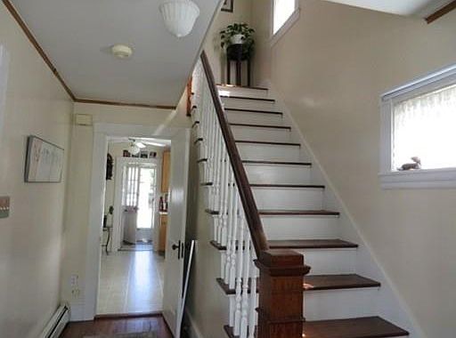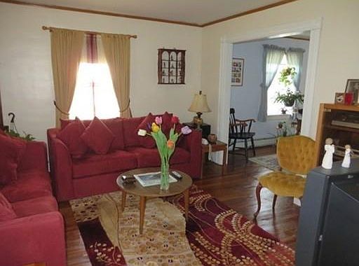 A Charming Antique in the center of Town. Relax on the front porch and watch the goings on or take a walk to shops and restaurants, town park, or enjoy walking the Holliston Trails down the street. This home offers hardwood floors throughout, a comfortable living room opens into the formal dining room with built in china cabinet. The sun pours into the kitchen in the afternoon which includes oak cabinets, an old fashioned pantry with lots of storage and leads to the back yard. There are two bedrooms with ceilings fans on the 2nd floor and a bonus room that would be an ideal nursery, office or huge walk in closet. The full bath includes a claw foot tub and tile floor. There are two beautiful stained glass windows, one in the living room and one on the 2nd floor landing. There is a pull down staircase to the attic which offers fabulous storage space allowing full standing height. The unfinished walkout basement has its own heat zone, great for a workshop. Septic replaced approx 8 yrs.