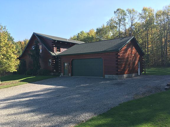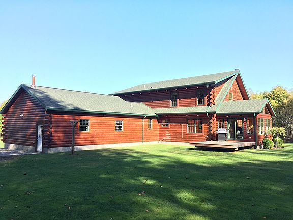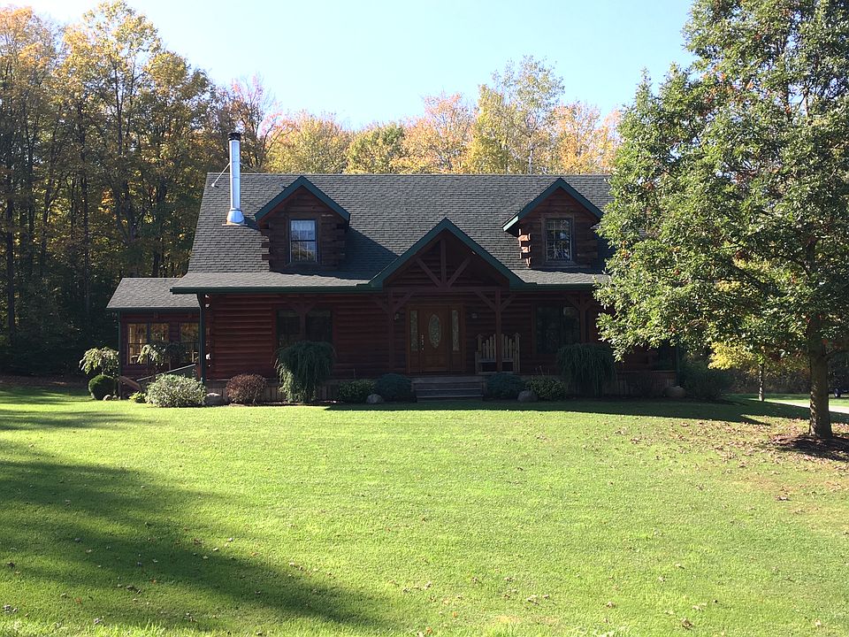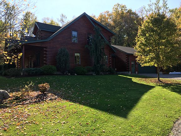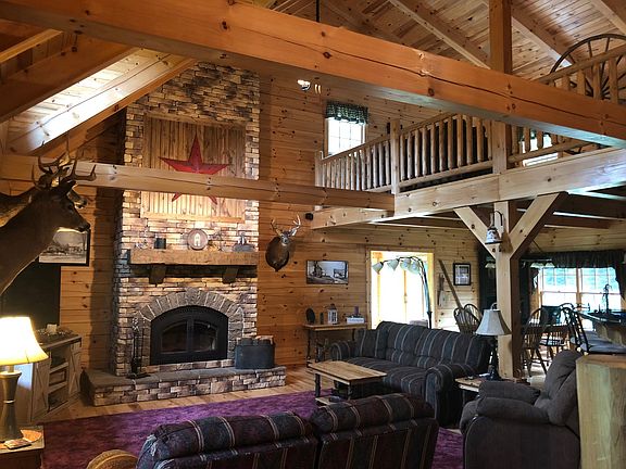 Custom Amish-Built Log Home offers an expansive open concept floor plan with a first floor private Master Suite. The floor-to-ceiling stone chimney is the focal point of the spacious great room, while a wood burning fireplace provides warmth to the entire home. A sun room with picturesque views is located off the dining area, which is adjacent to the modern kitchen offering an island cooktop stove and plenty of bar seating. Entry from the two and a half stall attached garage leads to a large mud room and a separate laundry area. A hallway featuring a large closet and half bath joins the mudroom to the main living area. The second floor boasts an open-to-below loft as well as an oversized bedroom and bathroom. The lower lever is semi-finished with a bedroom and attached bathroom as well as a large workshop/storage area with access to the outside. This property also has a 12' x 18' storage shed.