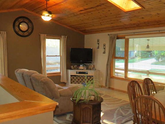 PEACEFUL COUNTRY SETTING Knotty-pine cathedral ceiling in this open-concept, 2-bed, 2-bath home with ceramic tile heated floors thru-out, master bedroom suite with walk-in closet and full bath, new refrigerator with french doors. Knotty-pine in lower level gives it a trendy cabin-look with large windows which adds plenty of sunlight in spacious family room or use it as an extra bedroom. Enjoy the great outdoors in this large, nicely landscaped yard or at the private beach and launch area on Bohners Lake.