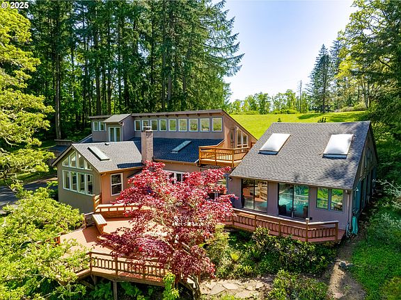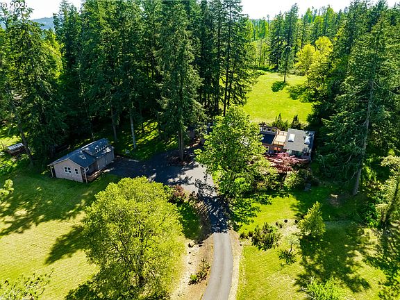 Move in ready NW Contemporary on 5 acres. Attached two car garage and detached 416sf shop/studio with bathroom and 720sf attached garage. Primary on main level, hardwood, vaults, skylights, wood burning fireplace, all appliances stay. 1200st solar heated pool and hot tub room with interior and exterior entrance. Paved drive, pasture, mature trees landscape and trees with creek accents. Two tax lots. Minutes from town, the airport, wineries and more. Please preview 86410 Pine Grove Road to fully appreciate all that it has to offer.
