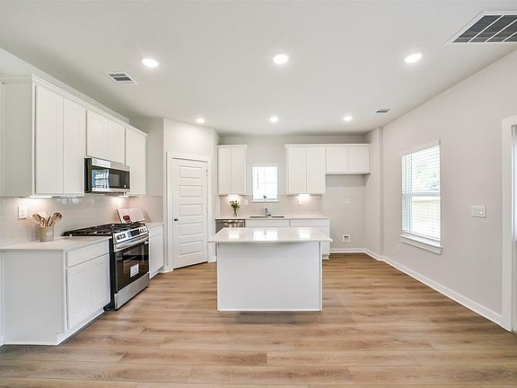 Welcome to The Trinity in the sought-after Lakes at Black Oak community. This exceptional 1,708 sq ft. residence is designed for modern living with a spacious open-concept main floor. The heart of the home is the eat-in kitchen, boasting a stylish kitchen island and sleek white cabinets, seamlessly flowing into the inviting family room. A covered patio offers the perfect spot for outdoor relaxation and entertainment. Upstairs, discover a flex space ideal for a home office or play area, alongside a primary suite featuring a large closet. Enjoy the privacy of having no back neighbors, enhancing your tranquility. The community enriches your lifestyle with amenities like a splash pad, a lake with a walking trail, a playground, an open pavilion with seating, and a mini soccer field. Located within the well-regarded Magnolia Independent School District, this home is estimated to be completed by September. Embrace the balance of comfort and leisure in this vibrant neighborhood.