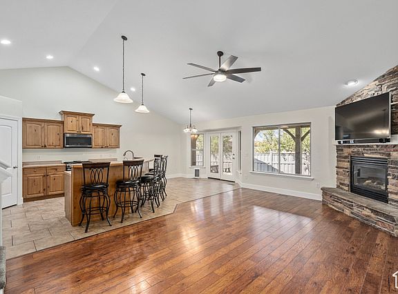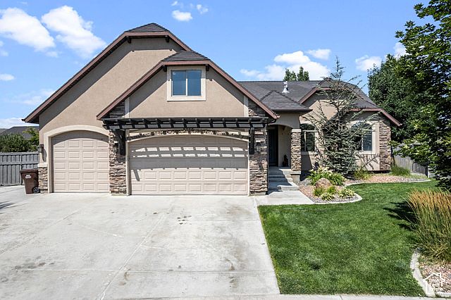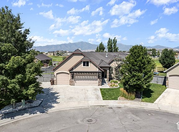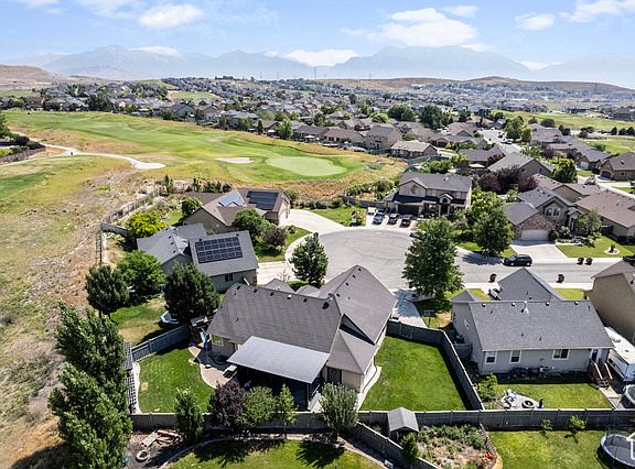 Welcome to this stunning 6-bedroom, 3-bathroom home situated on the scenic golf course in the Ranches of Eagle Mountain. Designed for the ultimate entertainer, this home boasts numerous features to enhance your lifestyle. Enjoy outdoor living on the covered deck, complete with a TV mount, or relax in the beautifully landscaped yard featuring a pergola with a fire pit, a climbing wall, and a playset. It is even wired for a hot tub. Inside, you'll find fresh new carpet and paint. The 4-car garage is a dream with its epoxy floor, abundant built-in storage, and an additional storage room. One of the 6 bedrooms has been thoughtfully converted into a functional office with built-in desks and bookshelves. The bonus room above the garage offers a spacious area perfect for an extra living space if you don't want to use it as a large bedroom. The finished basement continues the theme of entertainment, providing ample space for games and gatherings. As part of the community, you'll have access to a pool. Schedule your walk through today and make this incredible house your new dream home.