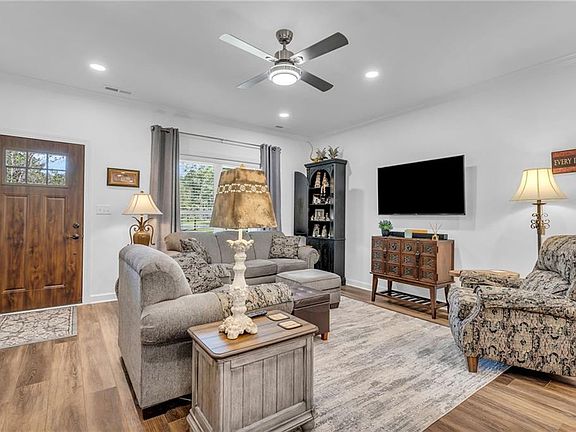 Step inside to discover an open floor plan with solid surface flooring throughout, ensuring a seamless flow and easy maintenance. The home is thoughtfully designed with accessibility in mind, featuring no steps for a convenient living experience. Additional features include a 2-car garage and gutter guards, adding to the home's functionality and low-maintenance living.