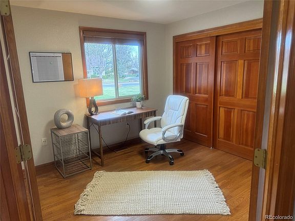 Wonderful ranch home in highly desirable Arvada, Colorado. You're greeted with warm, inviting hardwood floors, an open floorplan that flows from living room to dining to kitchen in open concept with wood burning fireplace for those chilly winter days. Gorgeous office with glass french doors opens off the living room with warm oak floors and richly finished wood trim doors. A full bathroom with jacuzzi tub and newly updated granite vanity greets you at the end of the hall, between a secondary bedroom and the primary suite. Primary suite is large, with en-suite bath, also updated with granite vanity top, neutral warm colors, and a walk-in closet.