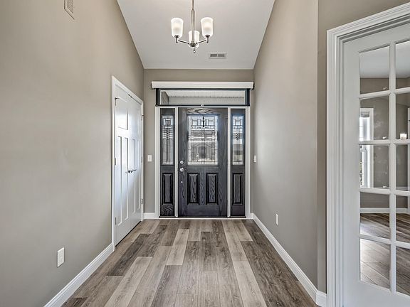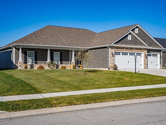 Fall in love with this custom-curated, split bedroom ranch built by Majestic Homes. This move-in ready stunner is better than new with it's modern stone facade and sprawling front porch. The inviting great room offers soaring ceilings, a gorgeous tile fireplace, and sparkling windows providing loads of natural light. The open floor-plan flows beautifully to the eat-in kitchen providing sleek quartz counters, custom cabinetry, Frigidaire Gallery stainless appliances and subway tile backsplash. Enjoy your morning coffee in the light & airy all-season room surrounded by walls of windows. The bonus home office w/glass french doors allows an extra living space or a quiet room to work or enjoy your favorite novel. Your spacious primary en-suite houses a massive walk-in closet, huge tiled shower, dual vanity w/cultured marble counters and a luxurious garden bathtub. Two sizable bedrooms and full bath w/dual vanity and contemporary tile are housed on the opposite wing. The laundry room w/cabinet storage, 3-car garage w/utility sink, irrigation and covered patio are just some of the extra amenities you get with this pristine home. Community pool, nearby walking trails, I-69 access and shopping make this a prime location.
