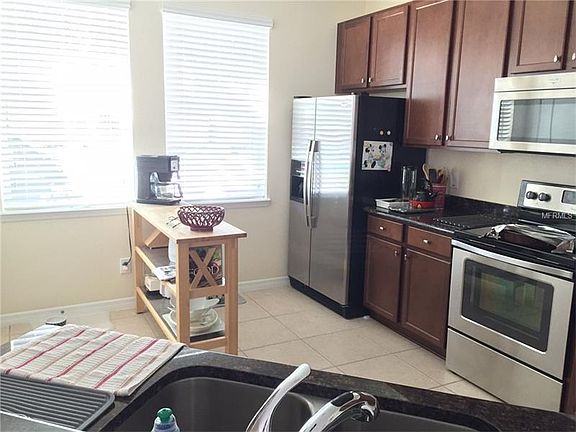 End unit townhome, 3/2.50, 1545 Sq.ft., two car garage, fenced courtyard. Kitchen has 42" cabinets, stainless steel appliances, granite countertops, breakfast area and breakfast bar. Tiled living areas and carpeted bedrooms. Inside laundry with washer, dryer. Fenced courtyard and community pool. Close to Disney, shopping and major roads.
