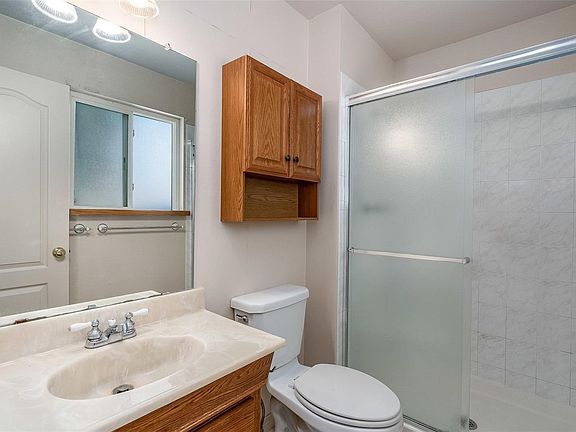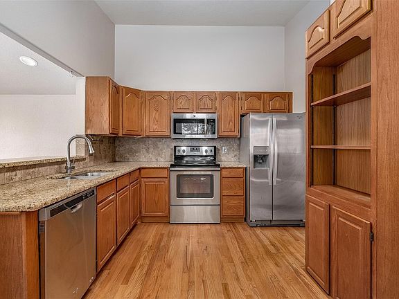 This Arvada tri-level home offers hardwood flooring, gas heating, vaulted ceilings, stainless steel appliances, granite kitchen countertops, a den, a patio, and a two-car garage.